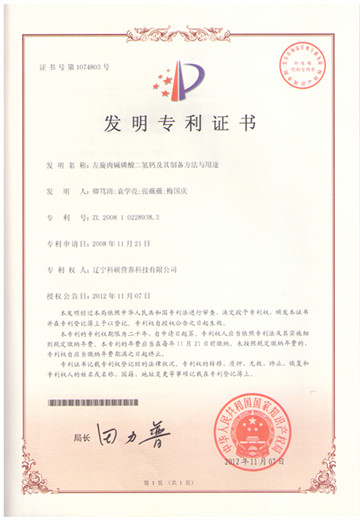 发时专利证书:左旋肉碱磷酸二氢钙及其制备方法与用途